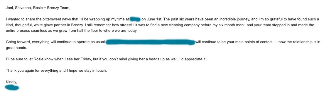 I wanted to share the bittersweet news that i'll be wrapping up my time at ____ on June 1st. The past six years have been an incredible journey, and I'm so grateful to have found such a kind, thoughtful, white glove partner in Breezy. I still remember how stressful it was to find a new cleaning company before my six month mark, and your team stepped in and made the entire process seamless as we grew from half the floor to where we are today.
