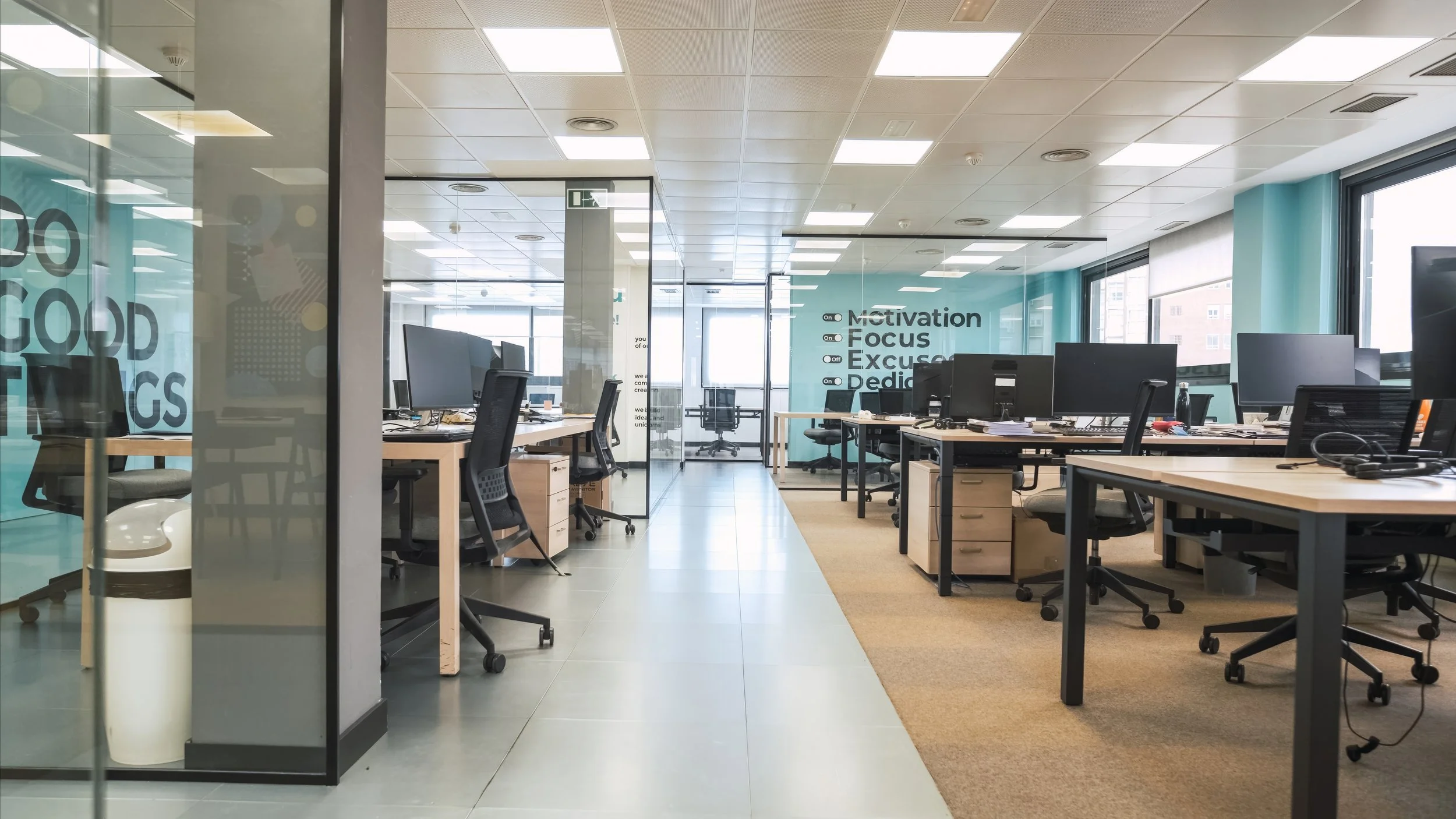 Spotless empty office with polished floors and organized desks after professional cleaning